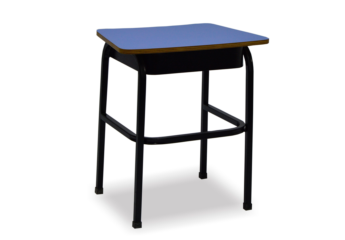 Superficie elaborada en aglomerado de 19mm enchapado en fórmica con canto rígido negro termofundidos a la madera. Estructura metálica con niveladores en tubo cuadrado con cajilla portalibros completa. No incluye silla